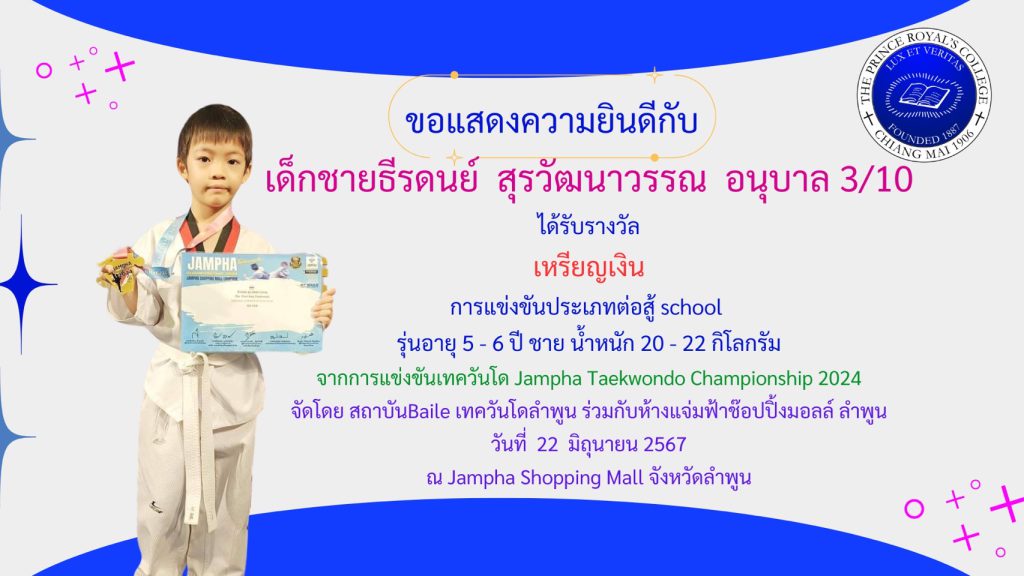 เด็กชายธีรดนย์ สุรวัฒนาวรรณ รางวัลการแข่งขันเทควันโด Jampha Championship 2024