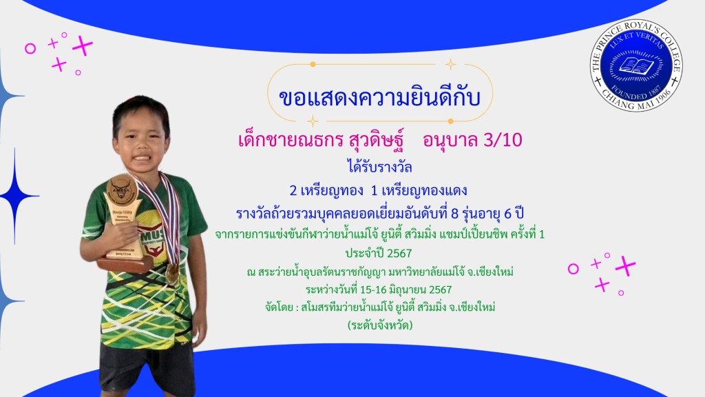 เด็กชายณธกร สุวดิษฐ์ รางวัลการแข่งขันกีฬาว่ายน้ำแม่โจ้ ยูนิตี้ สวิมมิ่ง แชมป์เปี้ยนชิพ ครั้งที่ 1 ประจำปี 2567