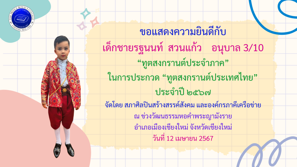 เด็กชายรฐนนท์ สวนแก้ว รางวัล “ทูตสงกรานต์ประจำภาค” ในการประกวด “ทูตสงกรานต์แห่งประเทศไทย” ประจำปี 2567