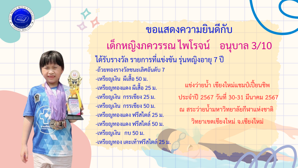 เด็กหญิงภควรรณ ไพโรจน์ รางวัลการแข่งขันว่ายน้ำ เชียงใหม่แชมป์เปี้ยนชิพ