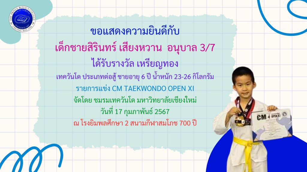 เด็กชายสิรินทร์ เสียงหวาน รางวัลการแข่งขันเทควันโด