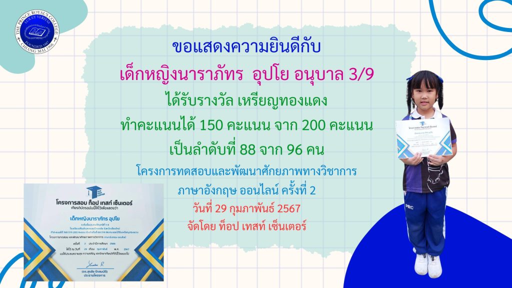 เด็กหญิงนาราภัทร อุปโย รางวัลโครงการทดสอบและพัฒนาศักยภาพทางวิชาการภาษาอังกฤษ