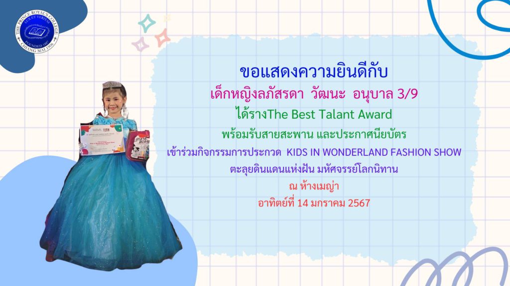 เด็กหญิงลภัสรดา วัฒนะ รางวัลกิจกรรมการประกวด KID IN WONDERLAND FASHION SHOW ตะลุยดินแดนแห่งฝัน มหัศจรรย์โลกนิทาน