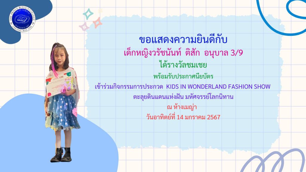 เด็กหญิงวรัชนันท์ ติสัก รางวัลกิจกรรมการประกวด KID IN WONDERLAND FASHION SHOW ตะลุยดินแดนแห่งฝัน มหัศจรรย์โลกนิทาน
