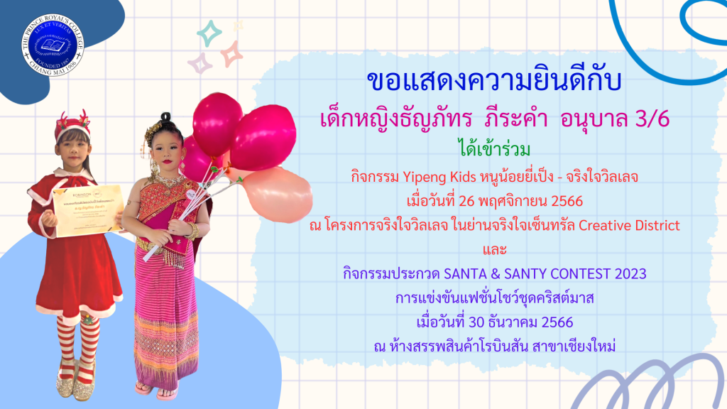 เด็กหญิงธัญภัทร ภีระคำ รางวัลการประกวดกิจกรรม Yipeng Kids หนูน้อยยี่เป็ง – จริงใจวิลเลจ และกิจกรรมประกวด SANTA & SANTY CONTEST 2023