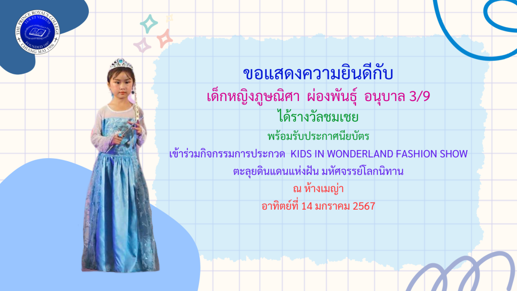 เด็กหญิงภูษณิศา ผ่องพันธุ์ รางวัลกิจกรรมการประกวด KID IN WONDERLAND FASHION SHOW ตะลุยดินแดนแห่งฝัน มหัศจรรย์โลกนิทาน