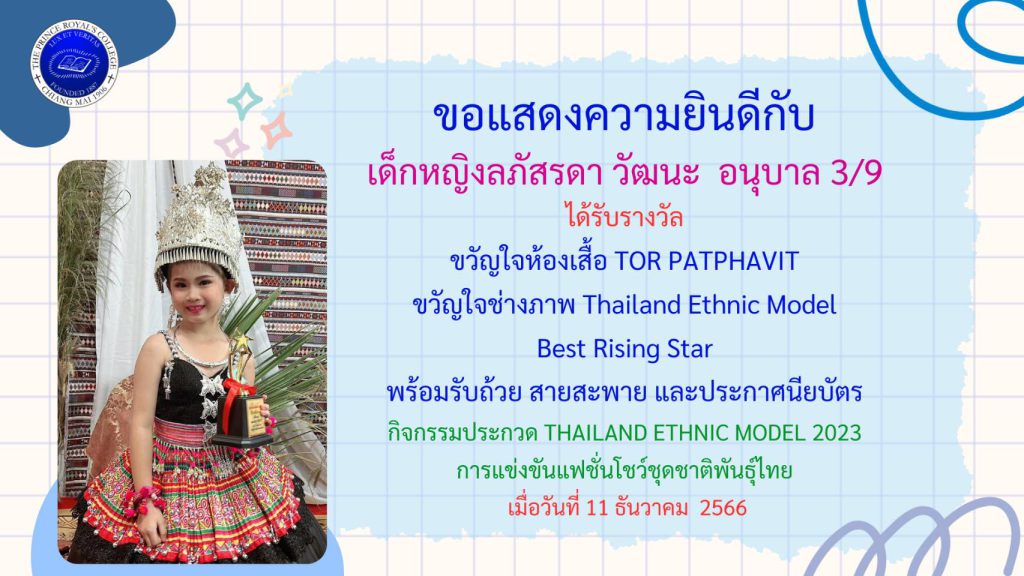 เด็กหญิงลภัสรดา วัฒนะ รางวัลกิจกรรมประกวด THAILAND ETHNIC MODEL 2023 การแข่งขันแฟชั่นโชว์ชุดชาติพันธุ์ไทย