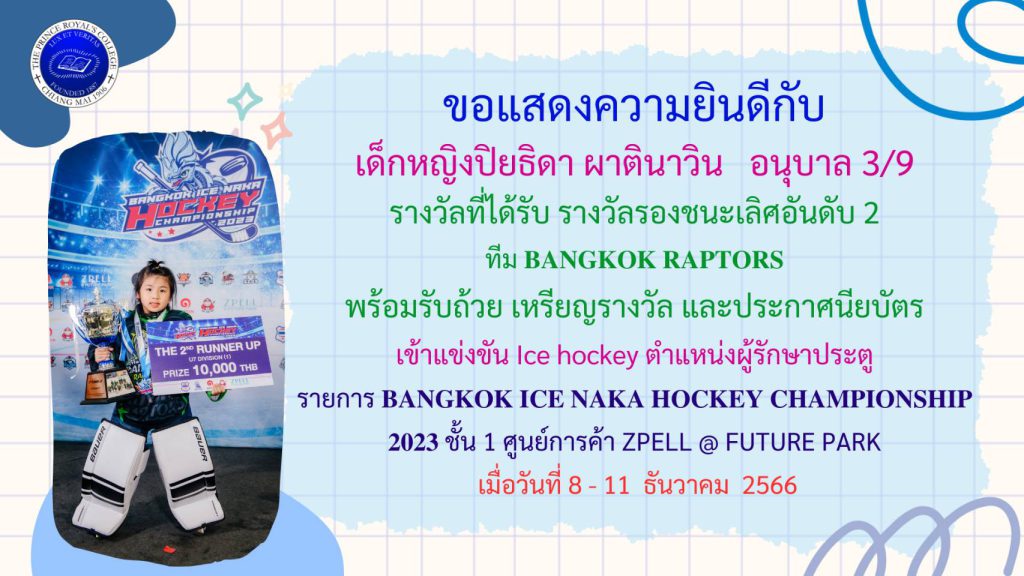 เด็กหญิงปิยธิดา ผาตินาวิน รางวัลเข้าแข่งขัน Ice hockey