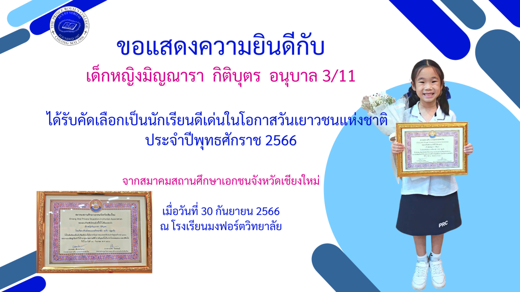 เด็กหญิงมิญณารา กิติบุตร นักเรียนดีเด่น ในโอกาสวันเยาวชนแห่งชาติ ประจำปีพุทธศักราช 2566