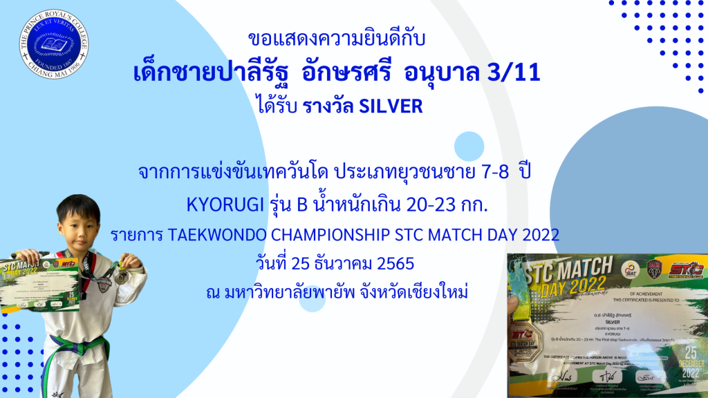 เด็กชายปาลีรัฐ อักษรศรี รางวัล SILVER การแข่งขันเทควันโด