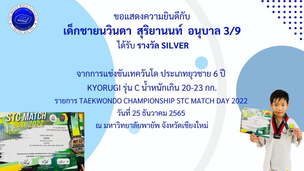 เด็กชายนวินดา สุริยานนท์ รางวัล SILVER การแข่งขันเทควันโด