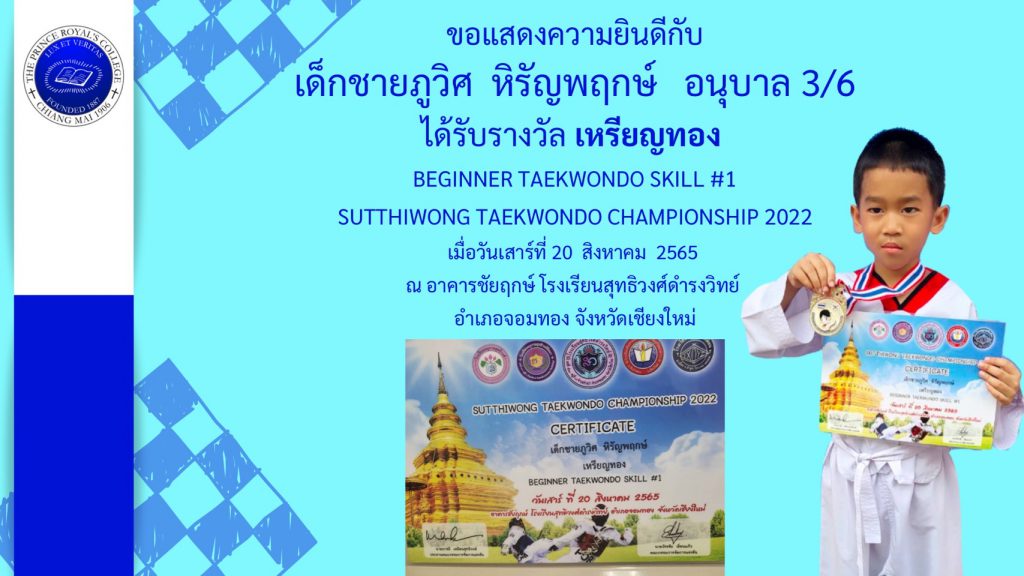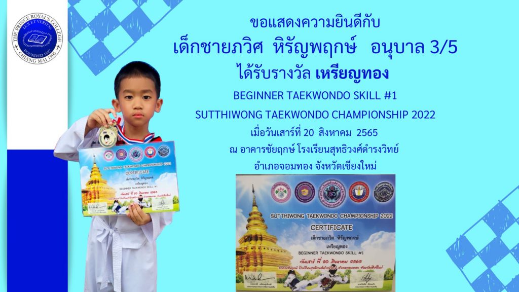 เด็กชายภูวิศ หิรัญพฤกษ์ รางวัลเหรียญทอง การแข่งขันเทควันโด