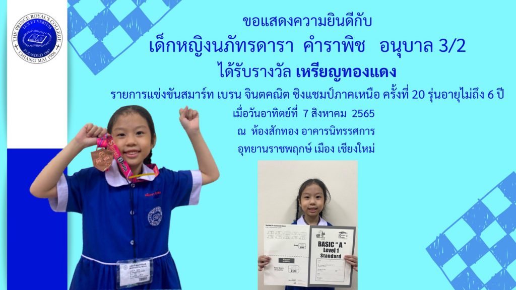 เด็กหญิงนภัทรดารา คำราพิช รางวัลเหรียญทองแดง การแข่งขันสมาร์ท เบรน