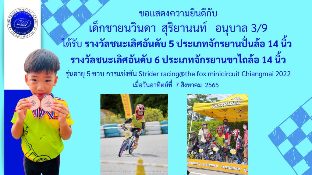 เด็กชายนวินดา สุริยานนท์ รางวัลชนะเลิศอันดับ 5 ประเภทจักรยานปั่นล้อ 14 นิ้ว และรางวัลชนะเลิศอันดับ 6 ประเภทจักรยานขาไถล้อ 14 นิ้ว