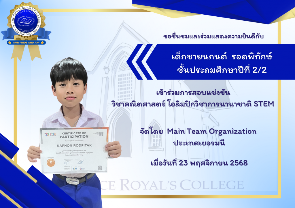 ขอชื่นชมและร่วมแสดงความยินดีกับเด็กชายนภนต์ รอดพิทักษ์ ชั้นประถมศึกษาปีที่ 2/2 ได้เข้าร่วมการสอบแข่งขัน วิชาคณิตศาสตร์ โอลิมปิกวิชาการนานาชาติ STEM รูปแบบออนไลน์