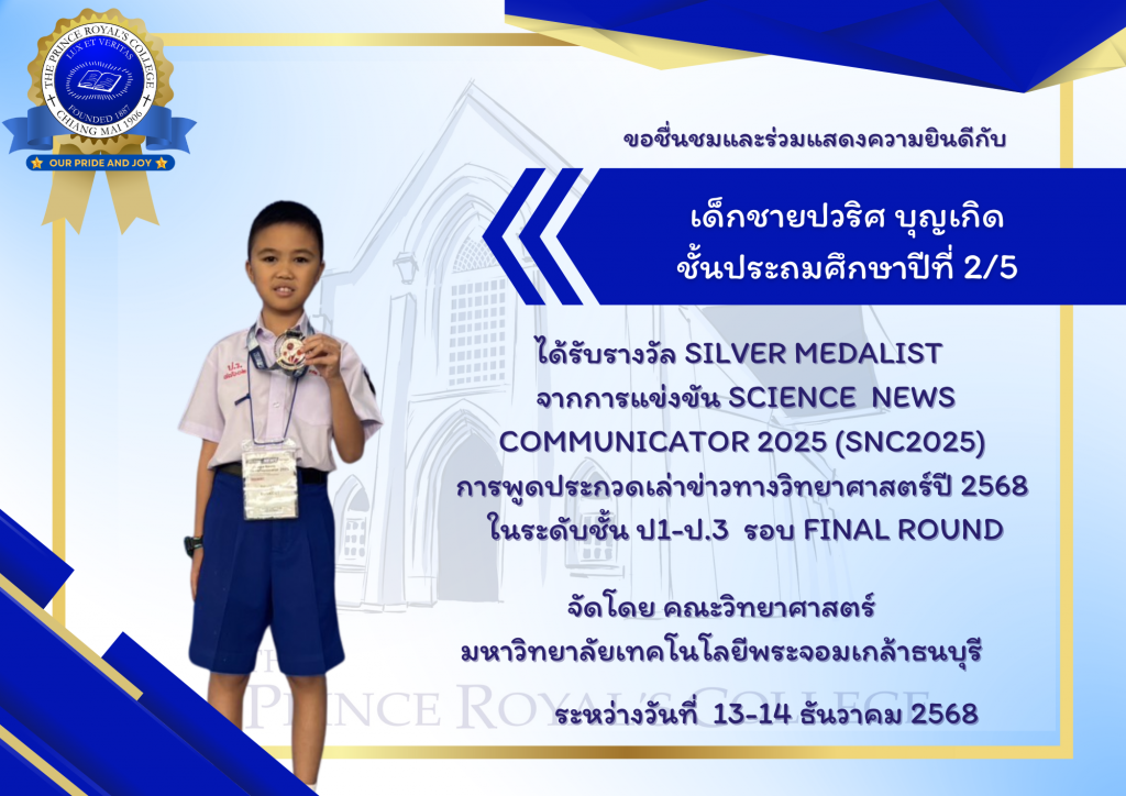 ขอชื่นชมและร่วมแสดงความยินดีกับ เด็กชายปวริศ บุญเกิด ชั้นประถมศึกษาปีที่ 2/5 ได้รับรางวัล SILVER MEDALIST จากการแข่งขัน SCIENCE NEWS COMMUNICATOR 2025 (SNC2025) การพูดประกวดเล่าข่าวทางวิทยาศาสตร์ปี 2568 ในระดับชั้น ป1-ป.3 รอบ FINAL ROUND ณ คณะวิทยาศาสตร์ มหาวิทยาลัยเทคโนโลยีพระจอมเกล้าธนบุรี