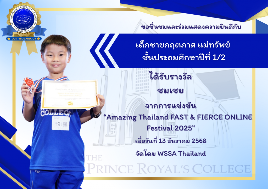 เด็กชายกฤตภาส แม่ทรัพย์ ชั้นประถมศึกษาปีที่ 1/2 ได้รับรางวัลชมเชย จากการแข่งขัน“Amazing Thailand FAST & FIERCE ONLINE Festival 2025”