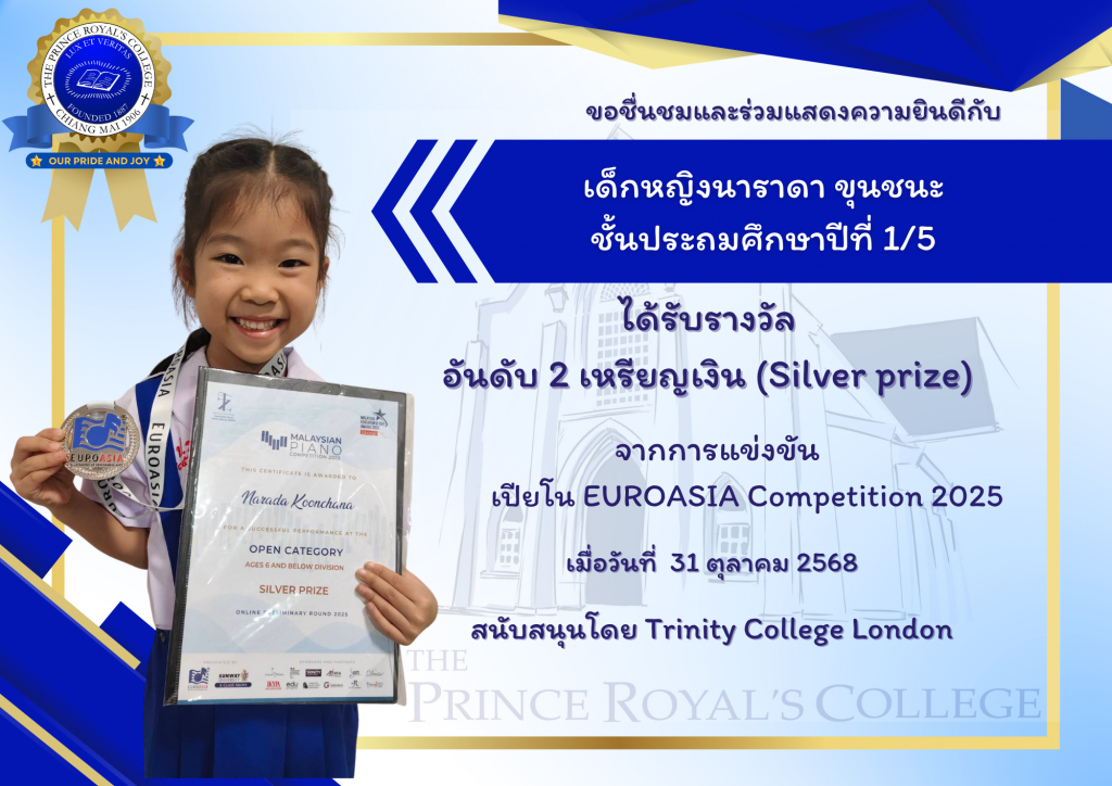 เด็กหญิงนาราดา ขุนชนะ ชั้นประถมศึกษาปีที่ 1/5 ได้รับรางวัลอันดับ2 เหรียญเงิน(Silver prize)ระดับนานาชาติOpen category ages 6 and below division