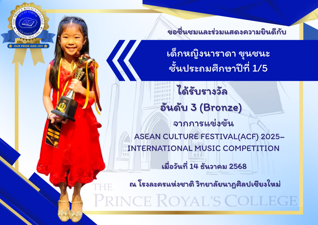 เด็กหญิงนาราดา ขุนชนะ ชั้นประถมศึกษาปีที่1/5 ได้รับรางวัลอันดับ 3(Bronze) จากการแข่งขันASEAN CULTURE FESTIVAL(ACF) 2025–INTERNATIONAL MUSIC COMPETITION