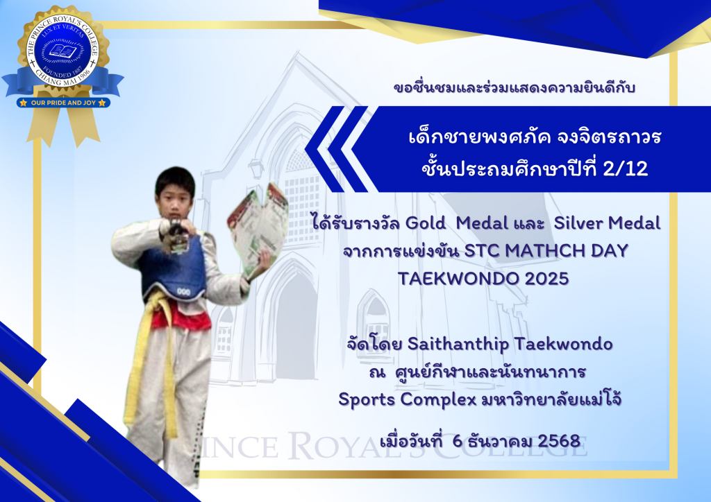 ขอชื่นชมและแสดงความยินดีกับเด็กชายพงศภัค จงจิตรถาวร ชั้นประถมศึกษาปีที่2/12 ได้รับรางวัลเหรียญทองและเหรียญเงิน จากการแข่งขัน STC MATHCH DAY TAEKWONDO 2025