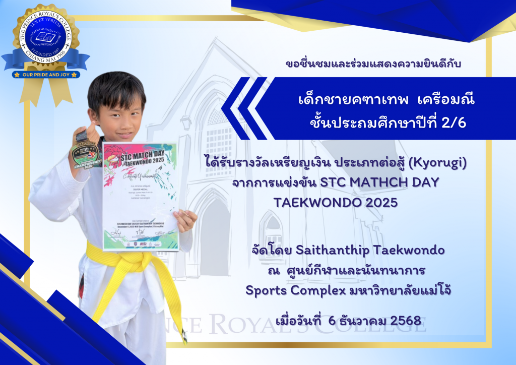 ขอชื่นชมและแสดงความยินดีกับ เด็กชายคฑาเทพ เครือมณี ชั้นประถมศึกษาปีที่ 2/6 ได้รับรางวัลเหรียญเงิน ประเภทต่อสู้ (Kyorugi) จากการแข่งขัน STC MATHCH DAY TAEKWONDO 2025
