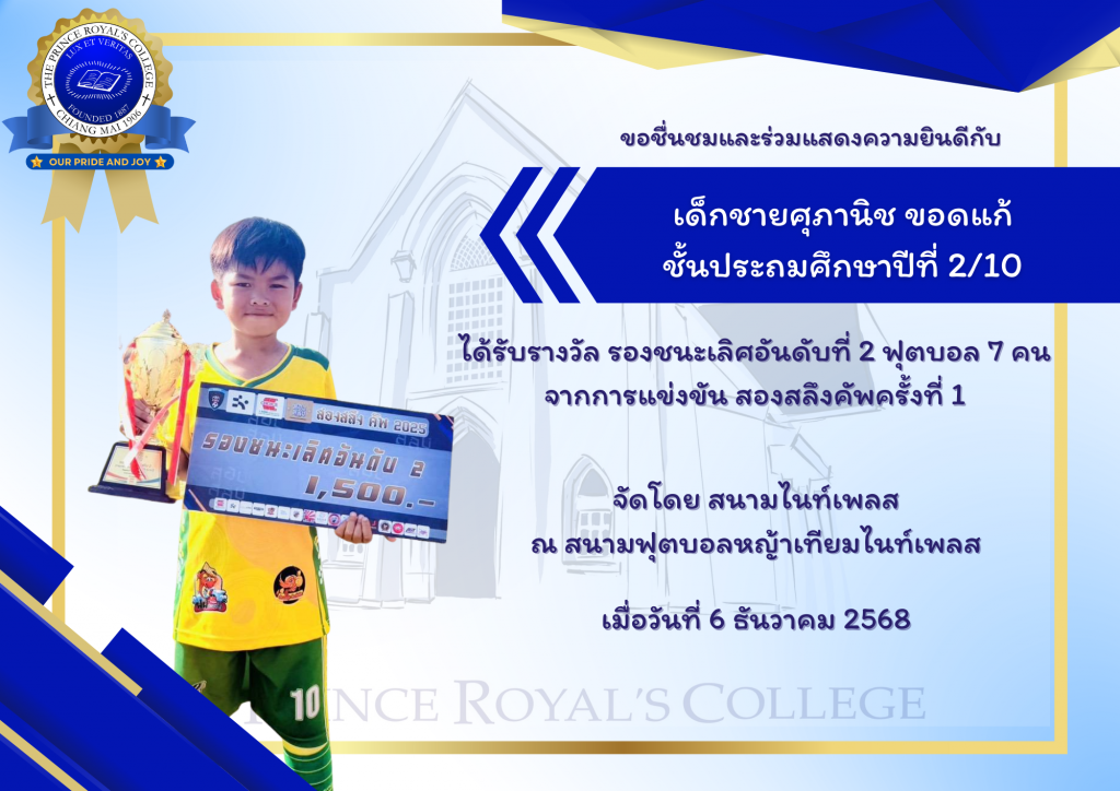 ขอชื่นชมและแสดงความยินดีกับ เด็กชายพฤกษพล พินิจพรพรรณ ชั้นประถมศึกษาปีที่ 2/3 ได้รับรางวัล ชนะเลิศ ฟุุตบอล 7 คน จากการแข่งขัน North World Cup U9