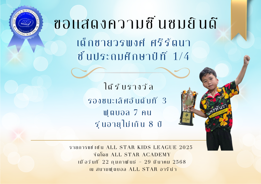 ขอชื่นชมและแสดงความยินดีกับ เด็กชายพฤกษพล พินิจพรพรรณ ชั้นประถมศึกษาปีที่ 2/3 ได้รับรางวัล ชนะเลิศ ฟุุตบอล 7 คน จากการแข่งขัน North World Cup U9