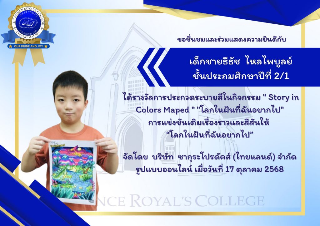 เด็กชายธีธัช ไหลไพบูลย ชั้นประถมศึกษาปีที่ 2/1 ได้รางวัลการประกวดระบายสีในกิจกรรม ” Story in Colors Maped ” “โลกในฝันที่ฉันอยากไป”การแข่งขันเติมเรื่องราวและสีสันให้ “โลกในฝันที่ฉันอยากไป”