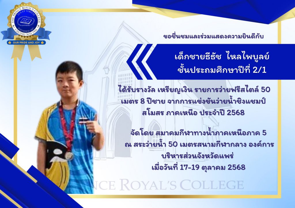 เด็กชายธีธัช ไหลไพบูลย ชั้นประถมศึกษาปีที่ 2/1 ได้รับรางวัล เหรียญเงิน รายการว่ายฟรีสไตล์ 50 เมตร 8 ปีชาย จากการแข่งขันว่ายน้ำชิงแชมป์สโมสร ภาคเหนือ ประจำปี 2568