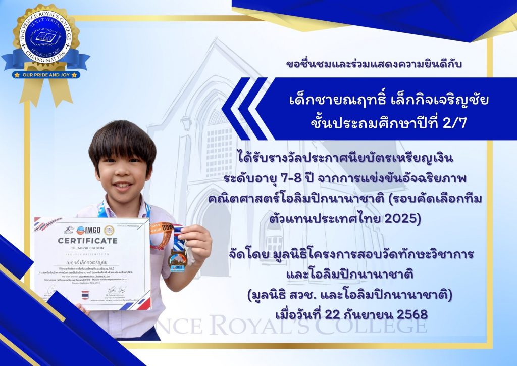 เด็กชายณฤทธิ์ เล็กกิจเจริญชัย ชั้นประถมศึกษาปีที่ 2/7 ได้รับรางวัลประกาศนียบัตรเหรียญเงิน ระดับอายุ 7-8 ปี จากการแข่งขันอัจฉริยภาพคณิตศาสตร์โอลิมปิกนานาชาติ (รอบคัดเลือกทีมตัวแทนประเทศไทย 2025)