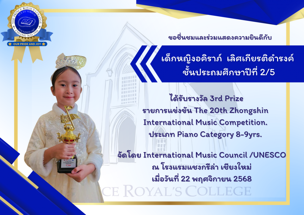เด็กหญิงอคิราภ์ เลิศเกียรติดำรงค์ ชั้นประถมศึกษาปีที่ 2/5 ได้รับรางวัล 3rd Prize รายการแข่งขัน The 20th Zhongshin International Music Competition ประเภท Piano Category 8-9 yrs.