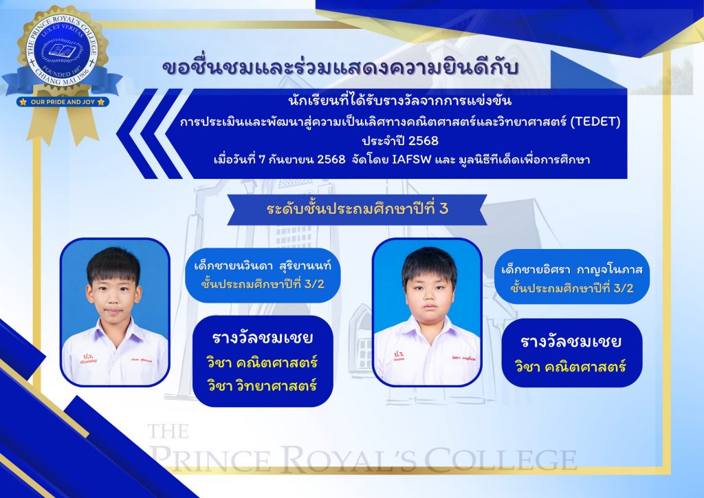 ขอชื่นชมและแสดงความยินดีกับนักเรียนที่ได้รับรางวัลจากการแข่งขัน การประเมินและพัฒนาสู่ความเป็นเลิศทางคณิตศาสตร์และวิทยาศาสตร์ (TEDET) ประจำปี 2568