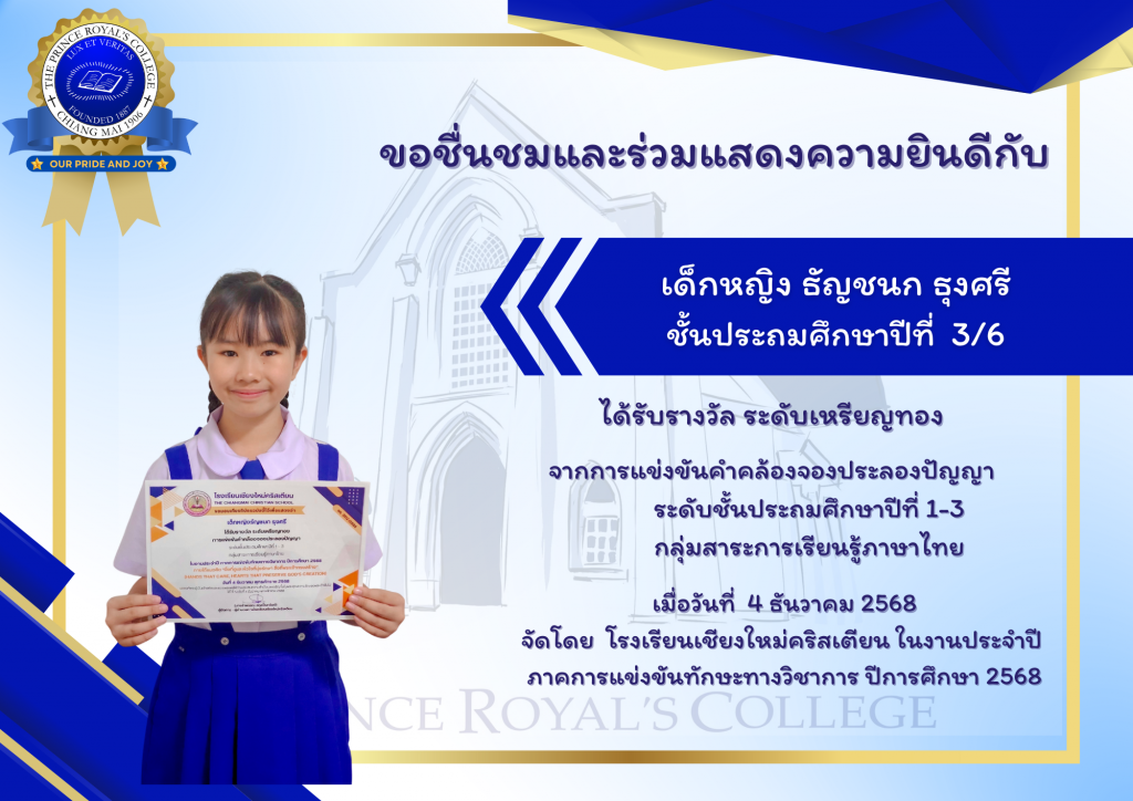 ขอชื่นชมและร่วมแสดงความยินดีกับ เด็กหญิงณัฏฐณิชา สุนทรวรเชษฐ์ ชั้นประถมศึกษาปีที่ 3/13 ได้รับรางวัล เหรียญเงิน ประเภทบุคคล ท่า 3-6-3 รุ่นอายุ 8 ปี เหรียญทองแดง ประเภทบุคคล ท่า 3-3-3 และ ท่า cycle รุ่นอายุ 8 ปี จากรายการที่ไปแข่งขัน กีฬาเรียงแก้วชิงแชมป์ประเทศไทย ชิงถ้วยพระราชทานสมเด็จพระกนิษฐาธิราชเจ้า กรมสมเด็จพระเทพรัตนราชสุดาฯ สยามบรมราชกุมารี รายการ WSSA 2025 Thailand Open Sport Stacking Championships
