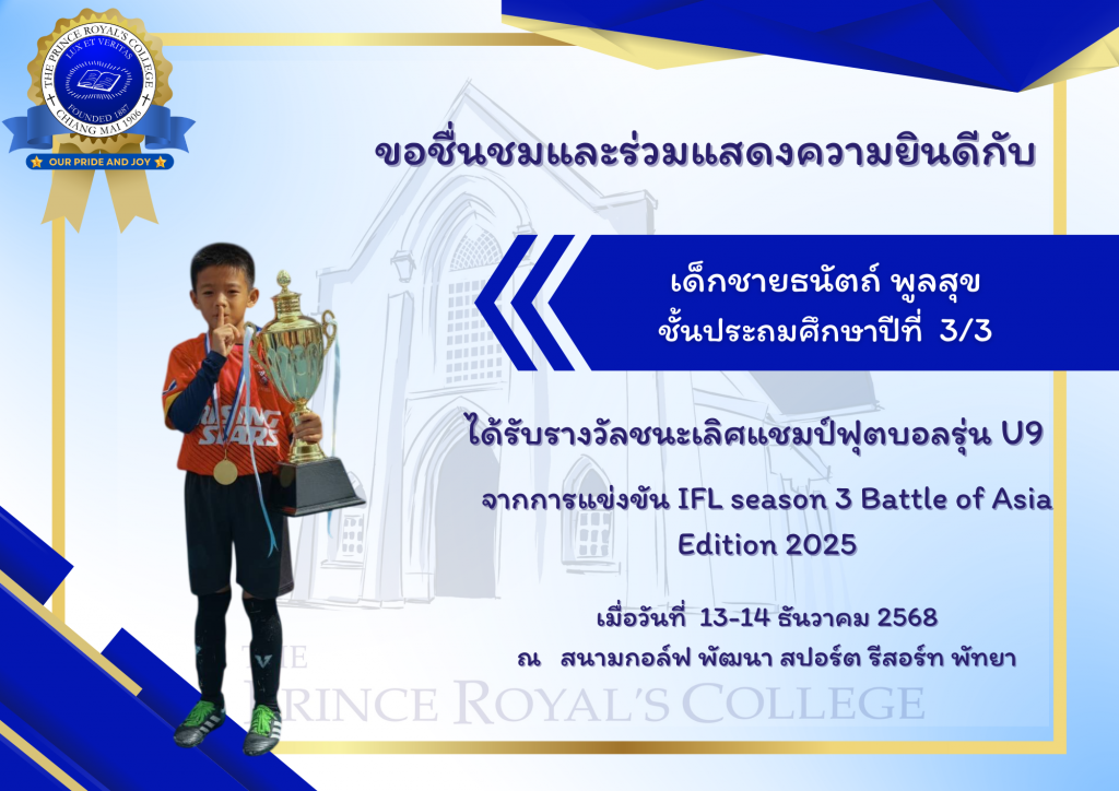 ขอชื่นชมและร่วมแสดงความยินดีกับ เด็กชายธนัตถ์ พูลสุข ชั้นประถมศึกษาปีที่ 3/3 ได้รับรางวัล ชนะเลิศแชมป์ฟุตบอลรุ่น U9 รายการที่ไปแข่ง IFL season 3 Battle of Asia Edition 2025