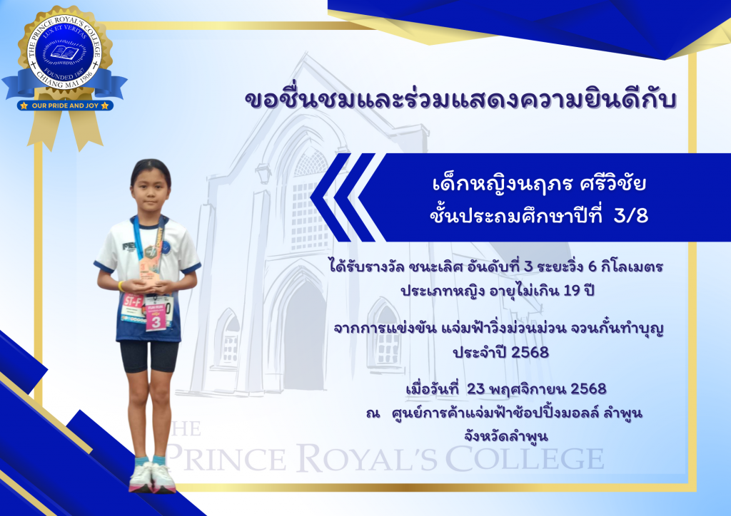 ขอชื่นชมและร่วมแสดงความยินดีกับ เด็กหญิงนฤภร ศรีวิชัย ชั้นประถมศึกษาปีที่ 3/8 ได้รับรางวัล รองชนะเลิศ อันดับที่ 1 ระยะวิ่ง 5 กิโลเมตร ประเภทหญิง อายุไม่เกิน 15 ปี จากรายการที่ไปแข่ง Technic Saraphi Run for Society 2025 “ก้าวของช่างฝีมือชน เพื่อสังคมที่แข็งแรง” ครั้งที่ 1