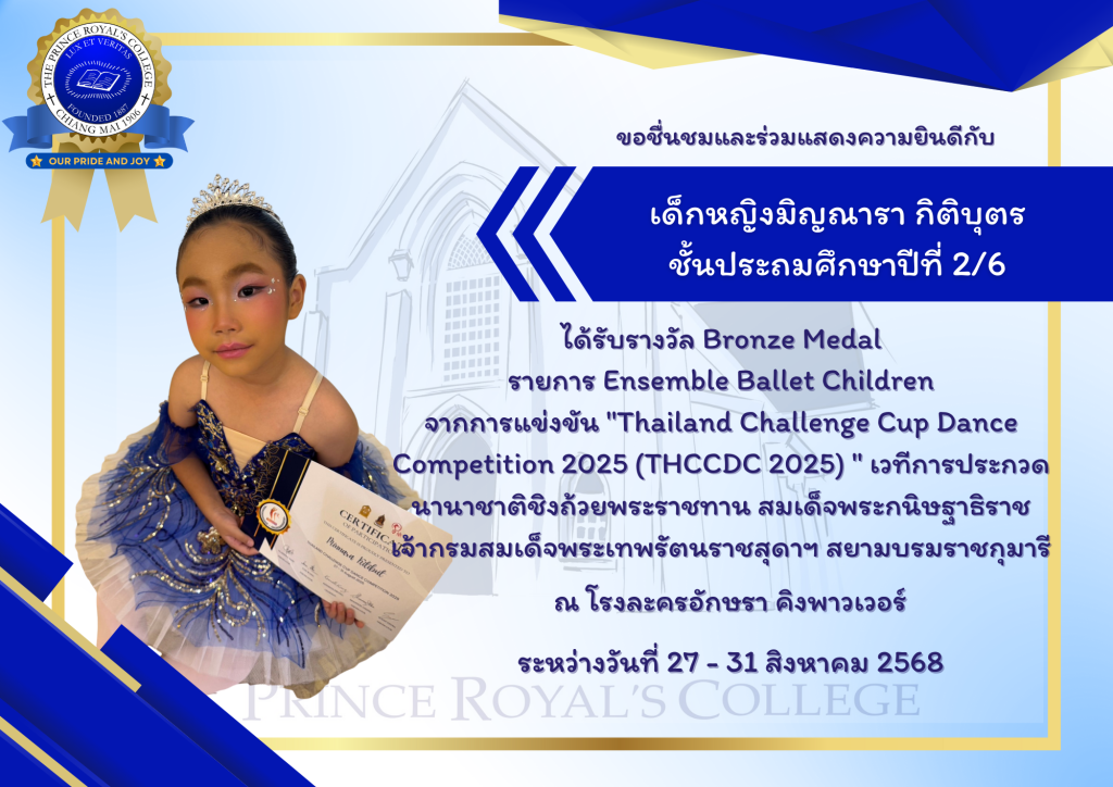 เด็กหญิงมิญณารา กิติบุตร ชั้นประถมศึกษาปีที่ 2/6 รางวัล Bronze Medal รายการ Ensemble Ballet Children จากการแข่งขัน “Thailand Challenge Cup Dance Competition 2025 (THCCDC 2025) ” เวทีการประกวดนานาชาติชิงถ้วยพระราชทาน สมเด็จพระกนิษฐาธิราช เจ้ากรมสมเด็จพระเทพรัตนราชสุดาฯ สยามบรมราชกุมารี