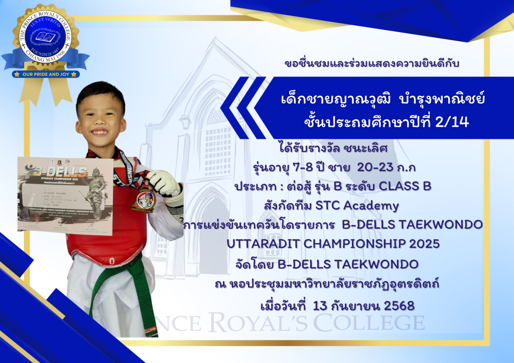 เด็กชายญาณวุฒิ บำรุงพาณิชย์ ชั้นประถมศึกษาปีที่ 2/14 ได้รับรางวัล ชนะเลิศ รุ่นอายุ 7-8 ปี ชาย 20-23 ก.ก ประเภท : ต่อสู้ รุ่น B ระดับ CLASS B สังกัดทีม STC Academy การแข่งขันเทควันโดรายการ B-DELLS TAEKWONDO UTTARADIT CHAMPIONSHIP 2025