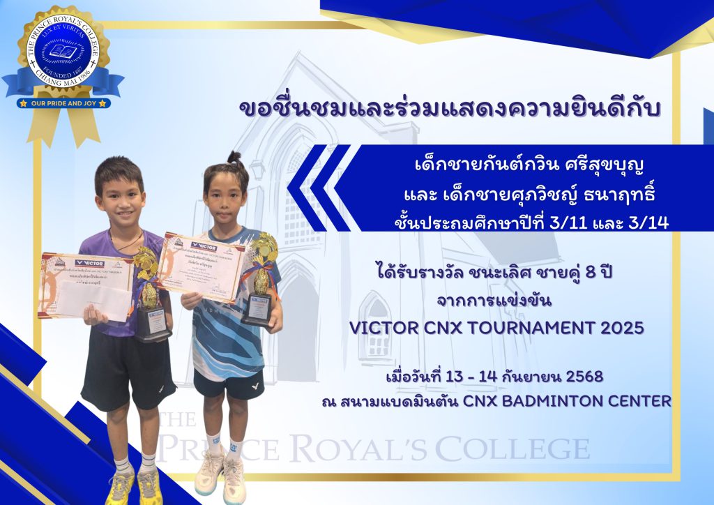 ขอแสดงความชื่นชมและร่วมยินดีกับเด็กชายกันต์กวิน ศรีสุขบุญ นักเรียนชั้นประถมศึกษาปีที่ 3/11 และ เด็กชายศุภวิชญ์ ธนาฤทธิ์ นักเรียนชั้นประถมศึกษาปีที่ 3/14 ได้รางวัล ชนะเลิศ ชายคู่ 8 ปี จากการแข่งขัน VICTOR CNX TOURNAMENT 2025