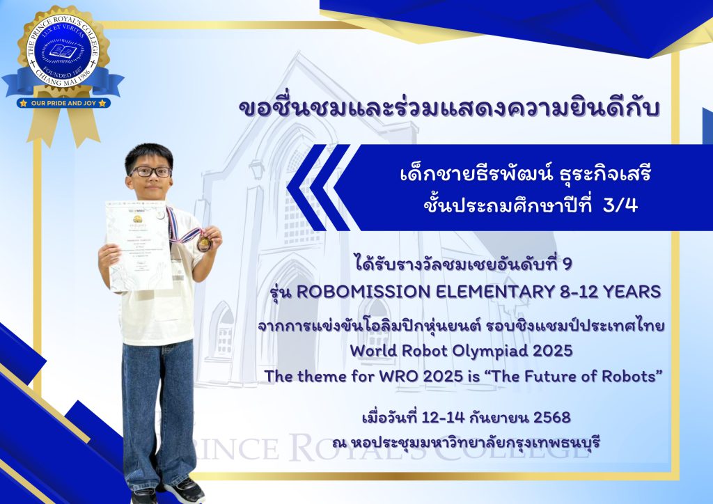 ขอแสดงความชื่นชมและร่วมยินดีกับเด็กชายธีรพัฒน์ ธุระกิจเสรี นักเรียนชั้นประถมศึกษาปีที่ 3/4 ได้รับรางวัลชมเชยอันดับที่ 9 รุ่น ROBOMISSION ELEMENTARY 8-12 YEARS จากการแข่งขันโอลิมปิกหุ่นยนต์ รอบชิงแชมป์ประเทศไทย World Robot Olympiad 2025