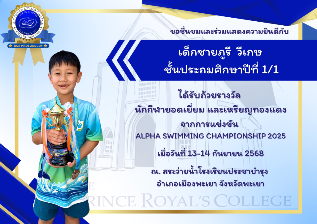 เด็กชายภูรี วีเกษ ชั้นประถมศึกษา 1/1 ได้รับถ้วยรางวัลนักกีฬายอดเยี่ยม อันดับที่ 6 รุ่นอายุ 7 ปี ชาย 1 เหรียญทองแดง ท่าฟรีสไตล์ 50 เมตร จากการแข่งขัน ALPHA SWIMMING CHAMPIONSHIP 2025