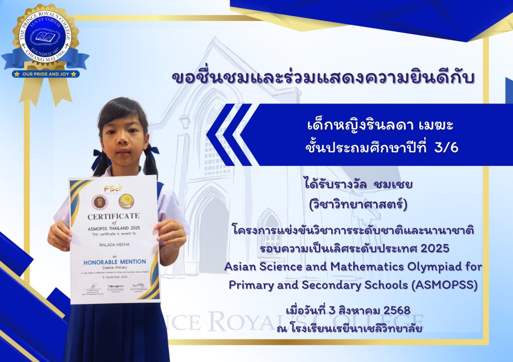 ขอแสดงความชื่นชมและร่วมยินดีกับเด็กหญิงรินลดา เมฆะ นักเรียนชั้นประถมศึกษาปีที่ 3/6 ได้รับรางวัล ชมเชย วิชาวิทยาศาสตร์ จากการแข่งขันASMOPSS THAILAND 2025