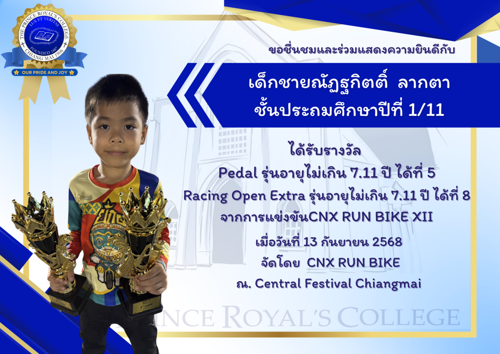 เด็กชายณัฏฐกิตติ์ ลากตา ชั้นประถมศึกษาปีที่ 1/11 ได้รับรางวัล Pedal รุ่นอายุไม่เกิน 7.11 ปี ได้ที่ 5 Racing Open Extra รุ่นอายุไม่เกิน 7.11 ปี ได้ที่ 8 จากการแข่งขันCNX RUN BIKE XII