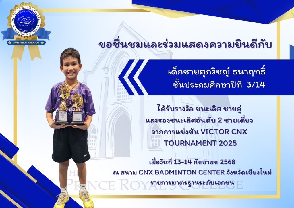 ขอแสดงความชื่นชมและร่วมยินดีกับเด็กชายศุภวิชญ์ ธนาฤทธิ์ นักเรียนชั้นประถมศึกษาปีที่ 3/14 ได้รับรางวัล ชนะเลิศ ชายคู่ และรองชนะเลิศอันดับ 2 ชายเดี่ยว จากการแข่งขัน VICTOR CNX TOURNAMENT 2025