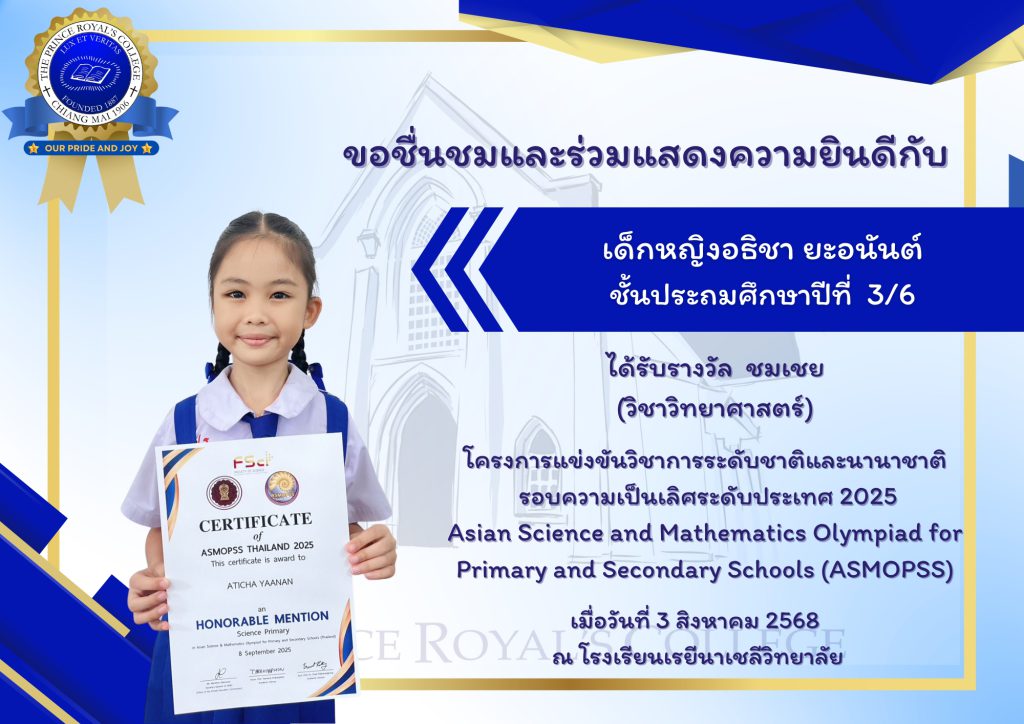 ขอแสดงความชื่นชมและร่วมยินดีกับเด็กหญิงอธิชา ยะอนันต์ นักเรียนชั้นประถมศึกษาปีที่ 3/5 ได้รับรางวัลชมเชย วิชาวิทยาศาสตร์ ชั้นประถมศึกษาปีที่ 3 จากการแข่งขัน ASMOPSS THAILAND 2025