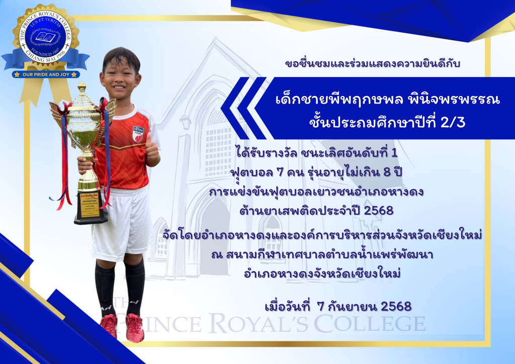 เด็กชายพีพฤกษพล พินิจพรพรรณ ชั้นประถมศึกษาปีที่ 2/3 ได้รับรางวัล ชนะเลิศอันดับที่ 1 ฟุตบอล 7 คน รุ่นอายุไม่เกิน 8 ปี การแข่งขันฟุตบอลเยาวชนอำเภอหางดง ต้านยาเสพติดประจำปี 2568