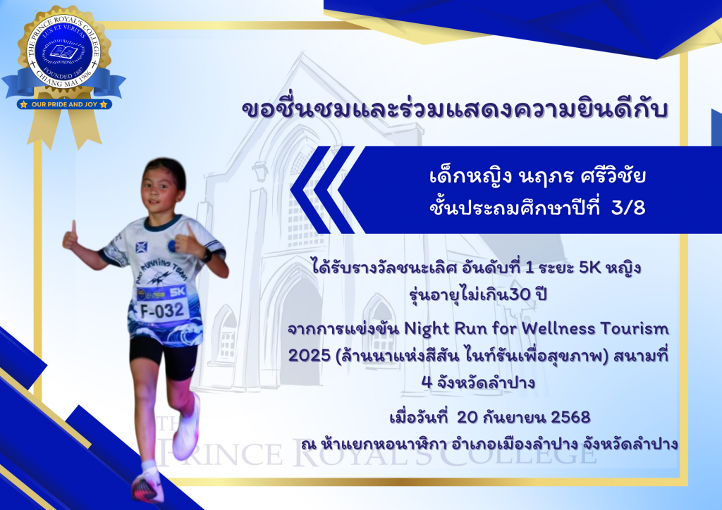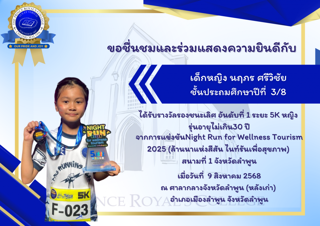 ขอชื่นชมและร่วมแสดงความยินดีกับ เด็กหญิงนฤภร ศรีวิชัย ชั้นประถมศึกษาปีที่ 3/8 ได้รับรางวัล รองชนะเลิศ อันดับที่ 1 ระยะ 5K หญิง รุ่นอายุไม่เกิน 30 ปี จากรายการที่ไปแข่ง Night Run for Wellness Tourism 2025 (ล้านนาแห่งสีสัน ไนท์รันเพื่อสุขภาพ) สนามที่ 1 จังหวัดลำพูน