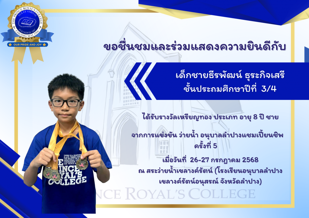 ขอชื่นชมและร่วมแสดงความยินดีกับ เด็กชายธีรพัฒน์ ธุระกิจเสรี ชั้นประถมศึกษาปีที่ 3/4 ได้รับรางวัล เหรียญทอง ประเภท อายุ 8 ปี ชาย เตะเท้าฟรีสไตล์ 25 เมตร ฟรีสไตล์ 25 เมตร ผลัดฟรีสไตล์ 2*25 เมตร คู่ผสม