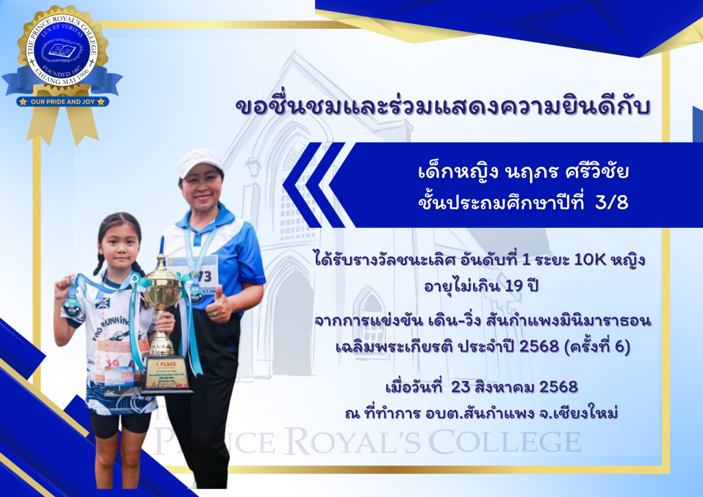 ขอชื่นชมและร่วมแสดงความยินดีกับ เด็กหญิงนฤภร ศรีวิชัย ชั้นประถมศึกษาปีที่ 3/8 ได้รับรางวัล ชนะเลิศ อันดับที่ 1 ระยะ 5K หญิง รุ่นอายุไม่เกิน 30 ปี จากรายการที่ไปแข่ง Night Run for Wellness Tourism 2025 (ล้านนาแห่งสีสัน ไนท์รันเพื่อสุขภาพ) สนามที่ 4 จังหวัดลำปาง