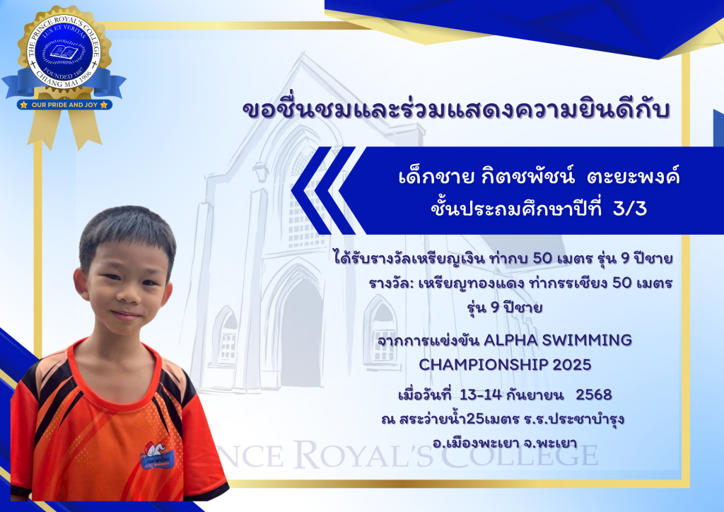 ขอชื่นชมและร่วมแสดงความยินดีกับ เด็กชายกิตชพัชน์ ตะยะพงค์ ชั้นประถมศึกษาปีที่ 3/3 ได้รับรางวัล เหรียญเงิน ท่ากบ 50 เมตร รุ่น 9 ปีชาย รางวัล เหรียญทองแดง ท่ากรรเชียง 50 เมตร รุ่น 9 ปีชาย จากรายการที่ไปแข่ง ALPHA SWIMMING CHAMPIONSHIP 2025