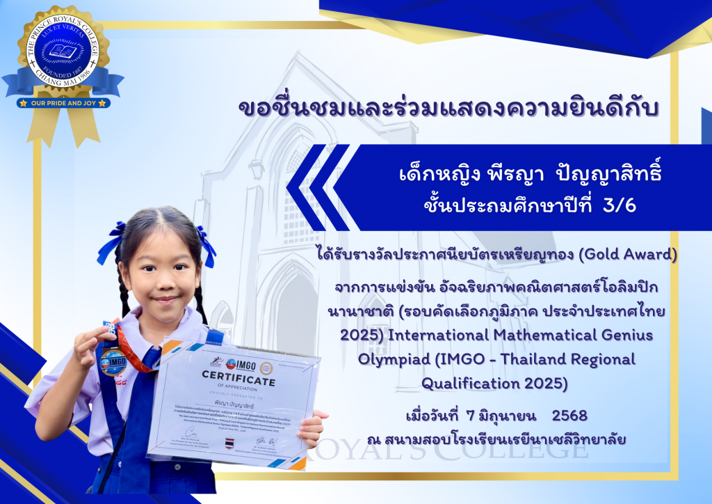 ขอชื่นชมและร่วมแสดงความยินดีกับ เด็กหญิงพีรญา ปัญญาสิทธิ์ ชั้นประถมศึกษาปีที่ 3/6 ได้รับรางวัล ประกาศนียบัตรเหรียญทอง (Gold Award) ระดับอายุ 7-8 ปี ( ผ่านเข้าสู่รอบคัดเลือกทีมตัวแทนประเทศไทย )